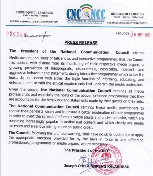 “The National Communication Council reminds these media practitioners to choose their panelists wisely and to ensure a better moderation of their programs in order to avert the spread of infamous verbal jousts and uncivil behavior, which are becoming increasingly popular in audiovisual content and which clearly are media excesses and a serious infringement on public order,” the press release read.