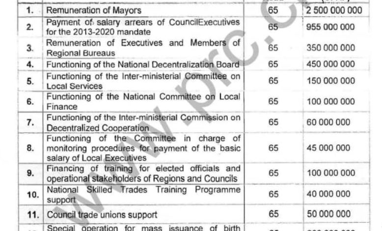 The amount allocated for general operations stands at FCFA 137 240 638 000, in which FCFA 5 Billion is meant for other uses. In the amount meant for other uses, mayors will be paid FCFA 2, 5 Billion while the arrears for council executives for the 2013-2020 mandate stands at 955 Million.