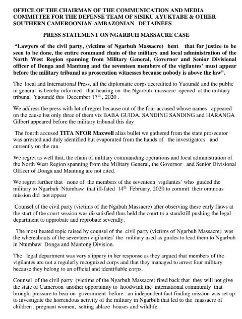 In a press statement, lawyers of the civil party, i.e victims of the Ngarbuh massacre believe that for justice to be done, the entire command chain of the military and local Administration of the North West region, spanning from the military general, governor, SDO for Donga Mantung Division and the seventeen (17) members of the vigilantes must appear before the military tribunal as prosecution witnesses because no one is above the law.