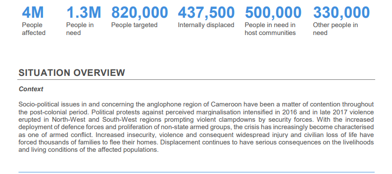 The United Nations Office for the Coordination of Humanitarian Affairs (OCHA) has confirmed that the Anglophone crisis has shifted into an armed conflict, affecting more than 4 million people, 1.3M in need, 820,000 People targeted, 437,500 Internally displaced, 500,000 People in need in host communities and 330,000 other people in need.