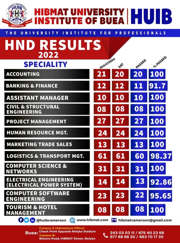 HUIB, an accredited private Anglo-Saxon University, is among the only three University Institutes in the South West Region, recognised by the Ministry of Higher Education (MINESUP) and the lone University mentored by two state Universities — the Universities of Buea and Bamenda.