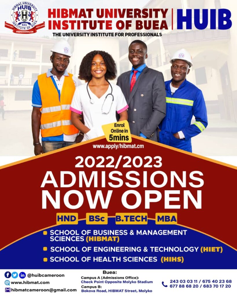 HUIB has officially opened admission into its three schools on its campuses in Buea and Douala for the 2022/2023 academic year: