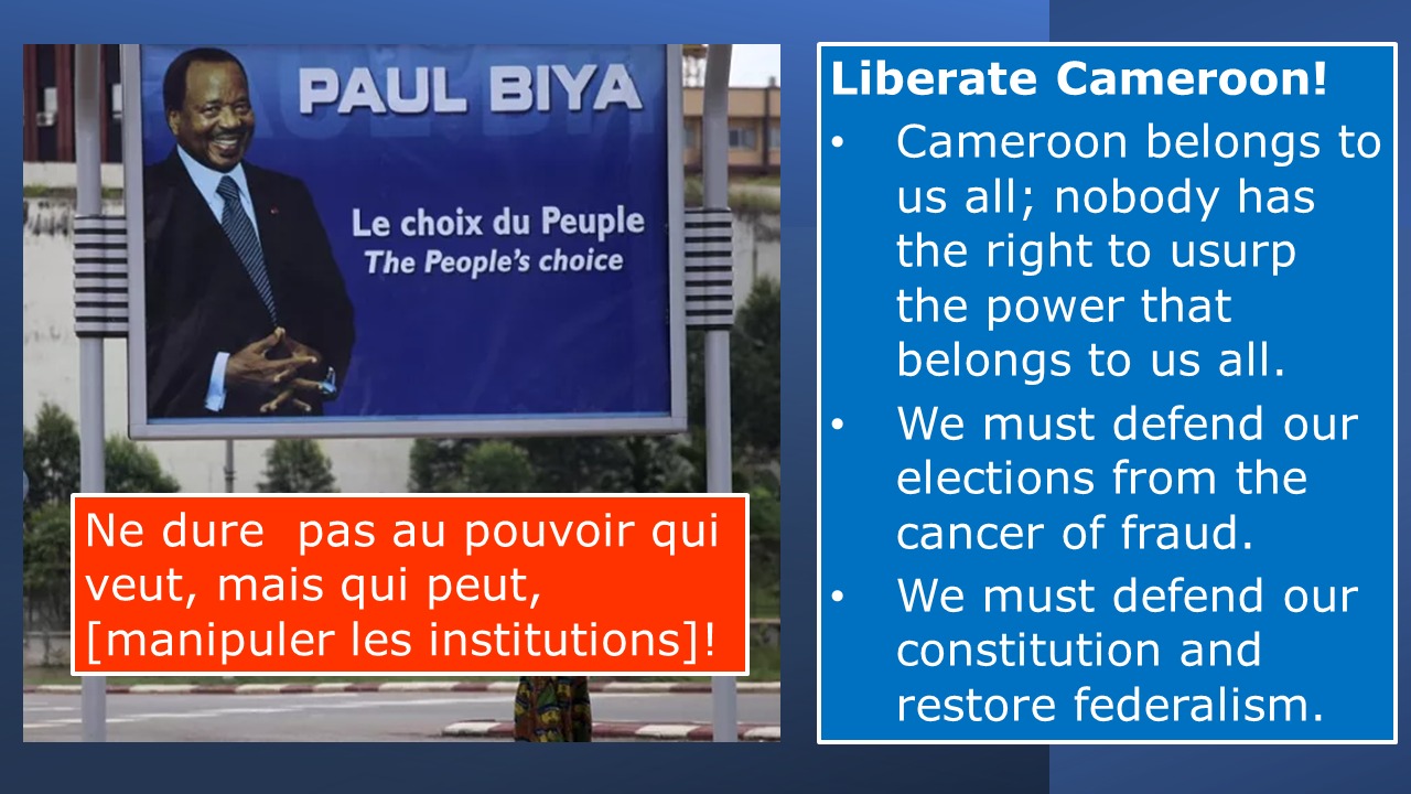In about 715 days or about 102 weeks, the current presidential mandate of Mr. Paul Biya will come to an end. Our constitution calls for a new election at the end of that mandate or before, in case he leaves office before the end of the mandate. This constitutional provision gives us a chance to free our country that has been taken captive by Mr. Biya through electoral fraud, tribalization, corruption, dangerous international commitments such as odious debts, and questionable foreign policy.