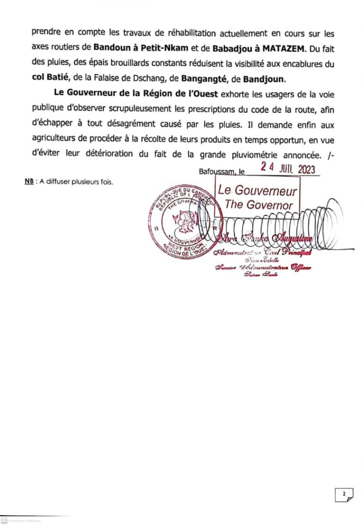 To road users especially transporters, the administrative authority advised that they remain vigilant especially on the Bandjoun – Petit-Nkam and Babadjou – Matazem stretches that are being rehabilitated.