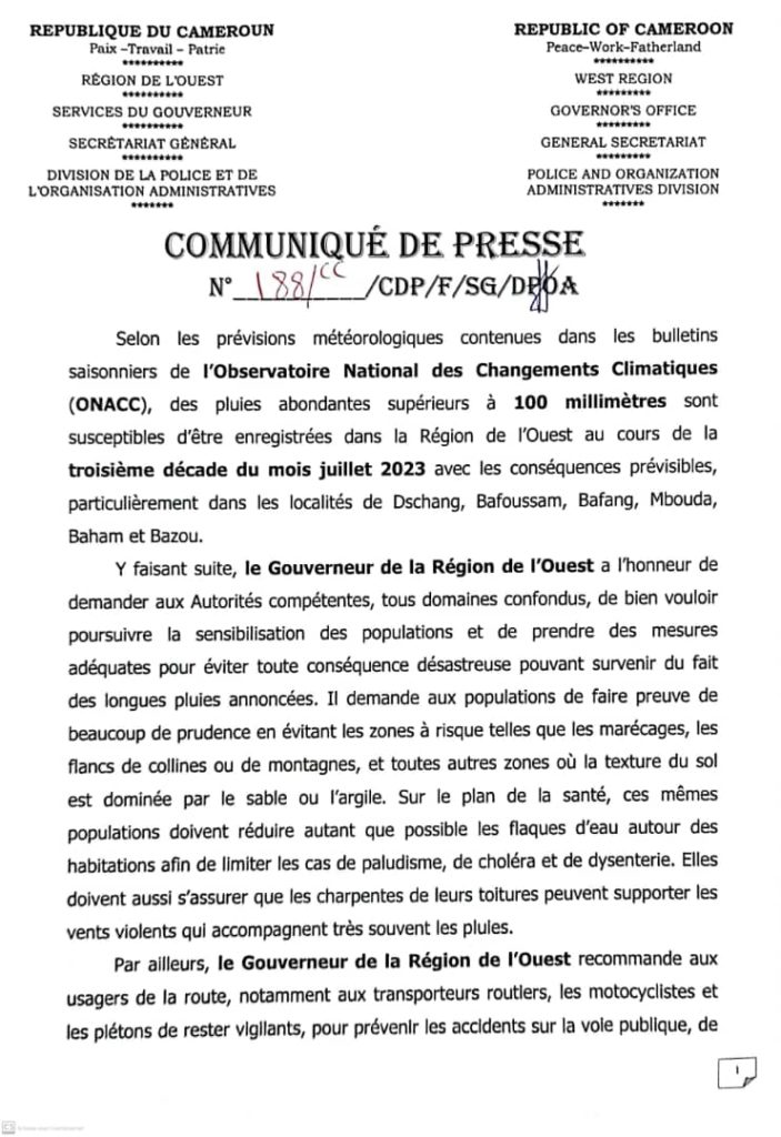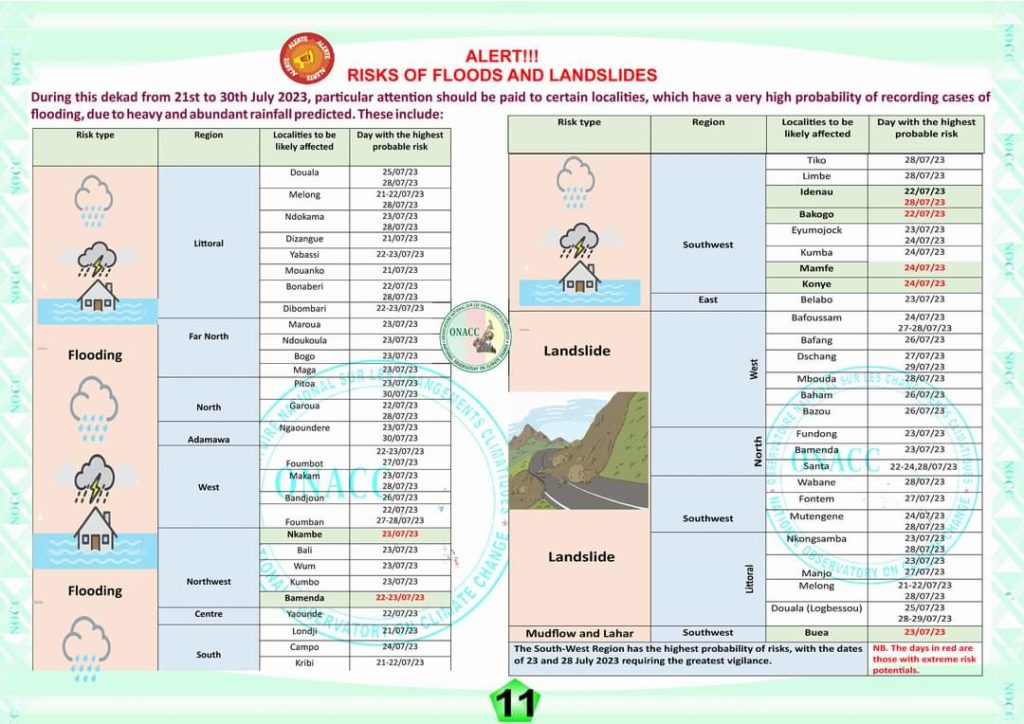 The localities mainly concerned are Dschang, Bafoussam, Mbouda, Bafang, Baham and Bazou where landslides have been predicted and Foumbot, Makam, Bandjoun and Foumban where floods are highly predicted due to heavy rains above 100 millilitres.