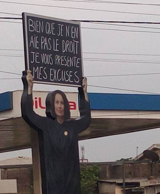 A placard held by the statue read, ” Even if I don’t have the right; I Apologize”…meaning France apologizes for all pains she inflicted on Cameroon during the colonial period.