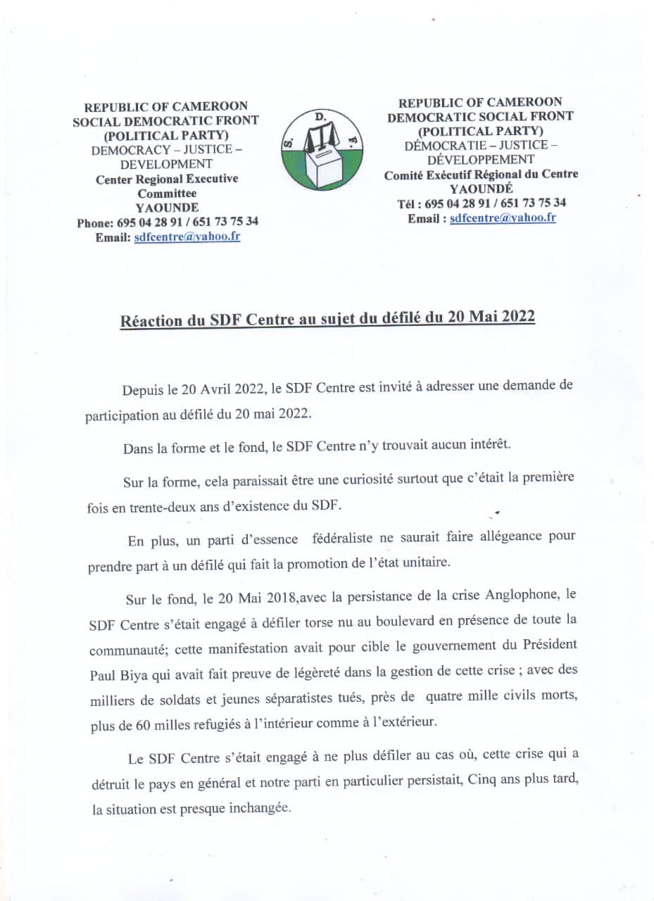 The Centre Regional Executive of the Social Democratic Front party has chosen to ignore the Mfoundi SDO who had invited Ni John Fru Ndi’s party to take part in the May 20 march past.