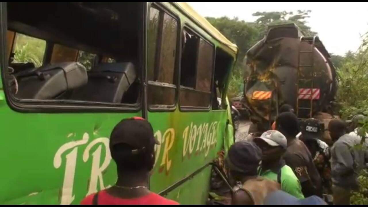 The driver of the bus who decided to crash behind the tanker that was transporting palm oil did so to avoid a head-on collision with an oncoming bus from the West region. The violent crash resulted in spillage of palm oil from the tanker.