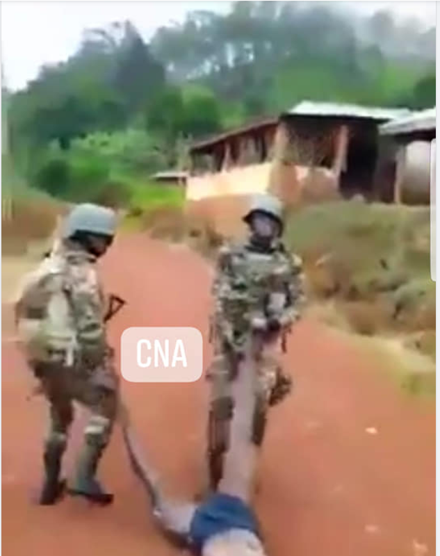 Government forces capture themselves on video torturing a civilian corpse in a locality called Mitayen Roundabout around a Bar called Kawasaki in Pinyin, Santa Subdivision, Northwest region.
