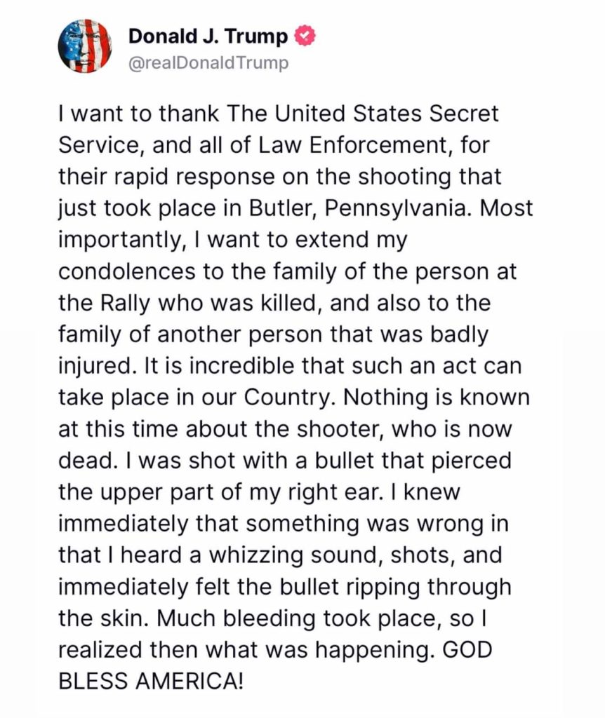 Trump thanked Secret Service and other officers for swiftly helping out during the attack. He also extended his condolences to the bereaved family of one attendee who was killed.