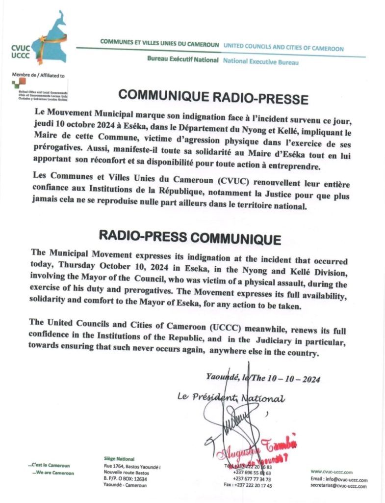 The United Councils and Cities of Cameroon has denounced an attack on the Mayor of Eseka by the Police on Thursday October 10, 2024.